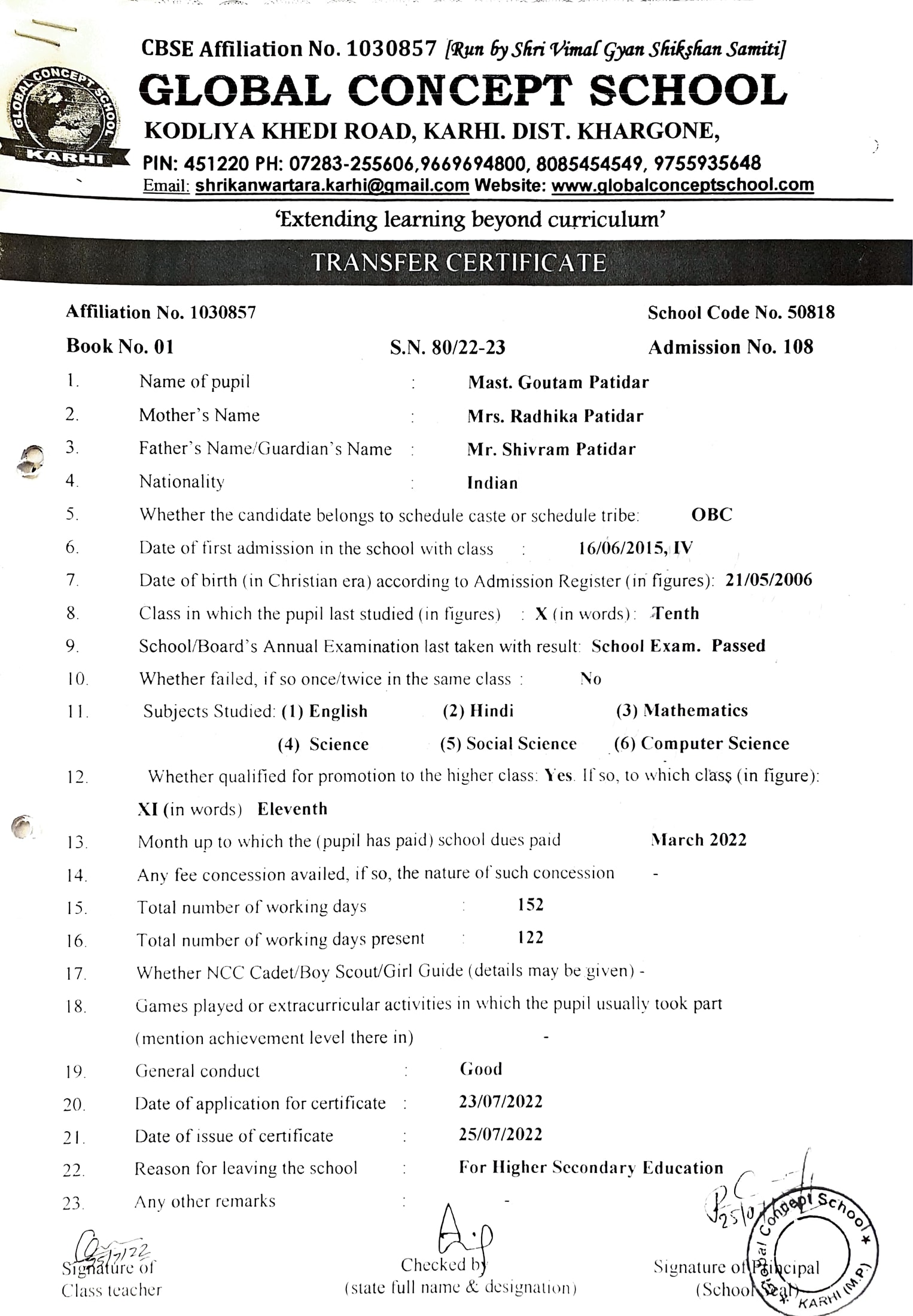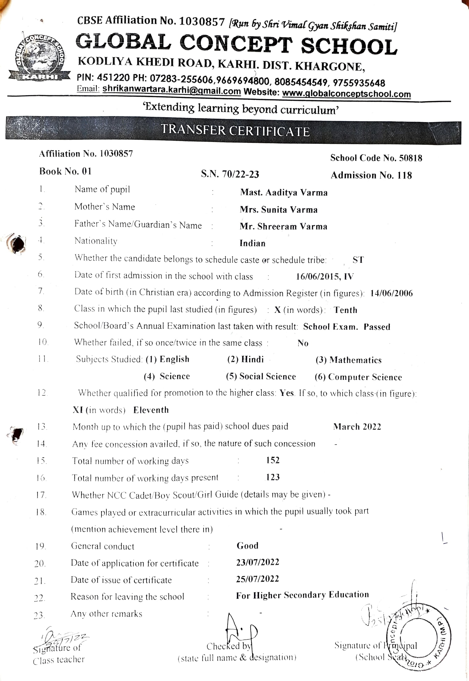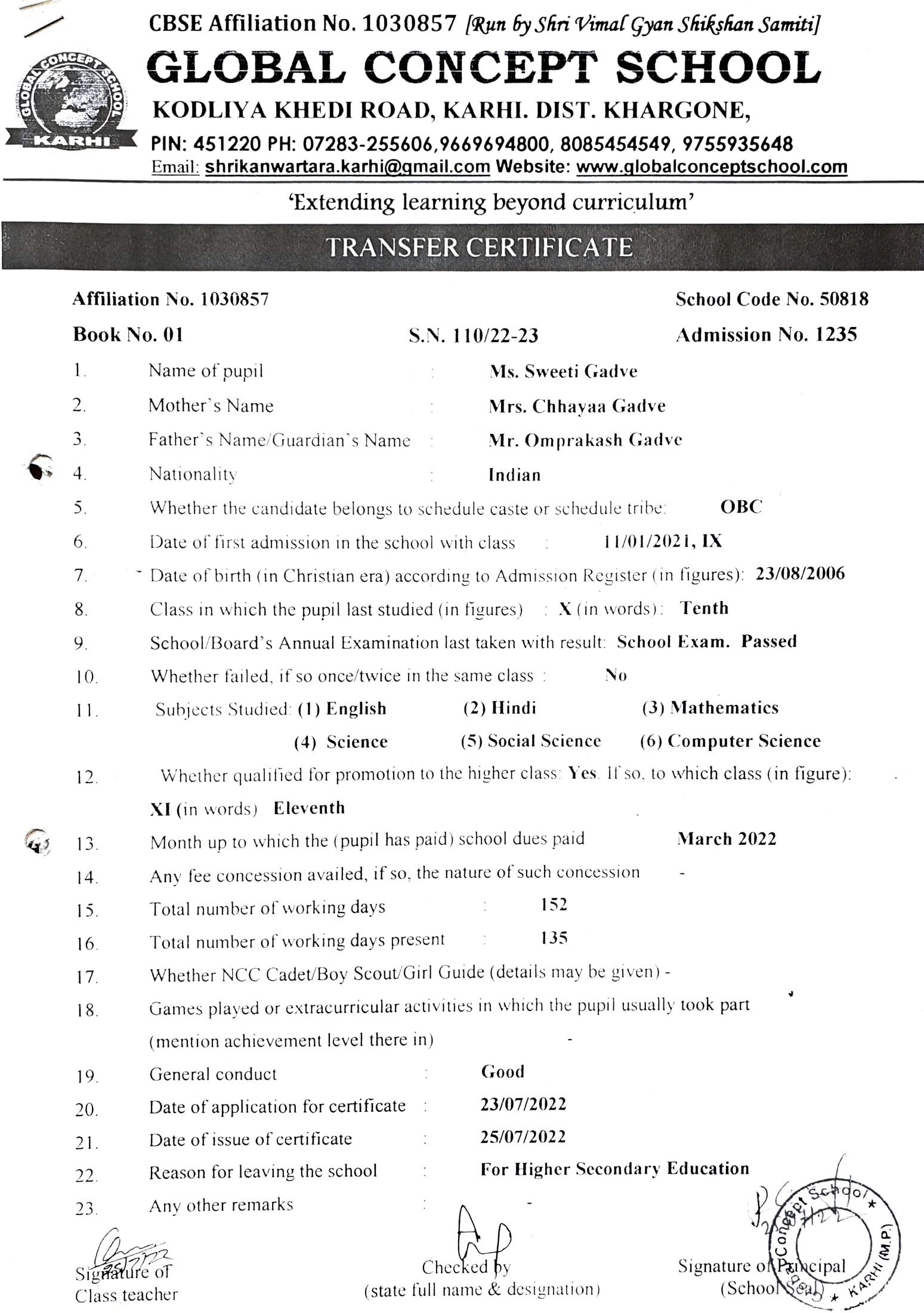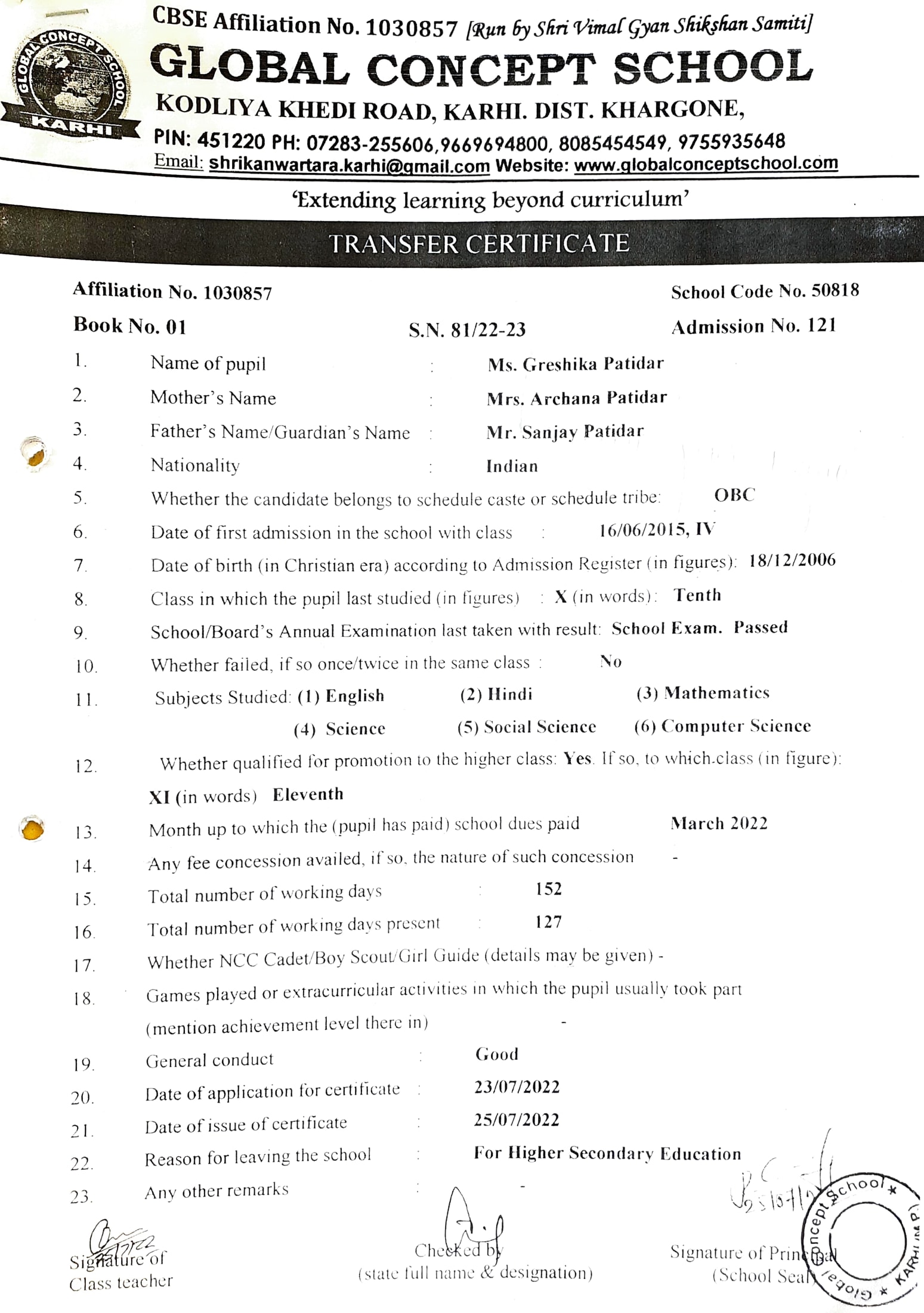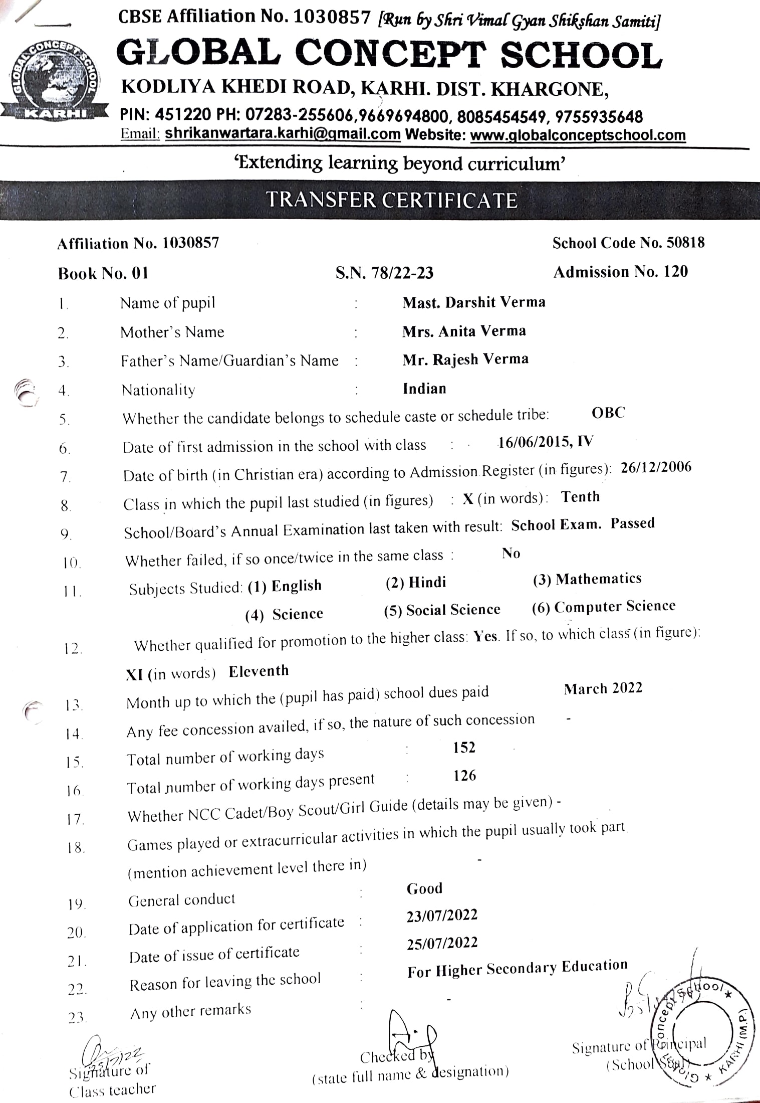 Global Concept School In front of Abhayraj Ginning Kodliyakhedi Road, Karhi PIN - 451220 DIST. - Khargone (M.P.)